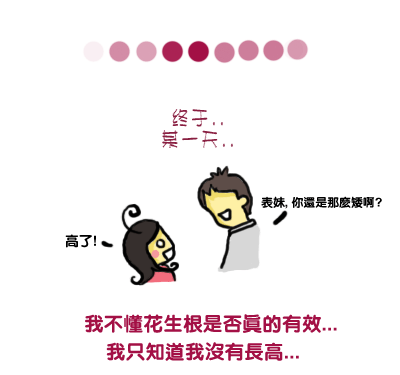 我想很多人都有听说过喝花生根泡的汤能够协助你长高, 说实在的..用在我身上根本没效力呢.. 以前中学时, 母亲听亲戚说喝了会高就立刻买回来给我喝...结果呢, 还是维持在153cm的高度里. 反而我的表兄弟们喝了都高了. 其实啊, 应该是因为男生比较容易长高吧, 尤其是他们都有定期做运动, 打篮球等. 我天天都在看电视啊...当然不会高了. 囧